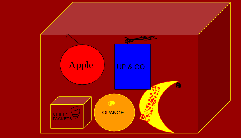 What's in my lunch box? In my lunch box as you can see I have a banana, up & go, an apple, chippy packets and an orange. The healthy foods are the apple, a banana and an orange. The ones that have sugar and salt are chips and up & go.